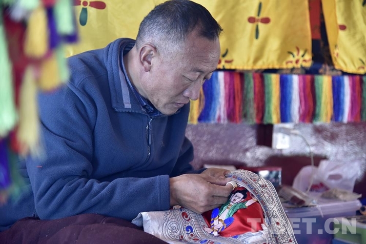 圖為2021年4月拍攝的西藏自治區(qū)非物質(zhì)文化遺產(chǎn)項(xiàng)目拉薩堆繡唐卡代表性傳承人羅布正在制作堆繡唐卡 攝影:王媛媛