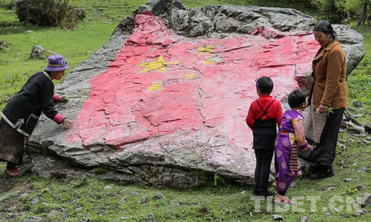 圖為卓嘎(左一)和央宗(右一)在巨石繪制的國(guó)旗旁 攝影:趙耀