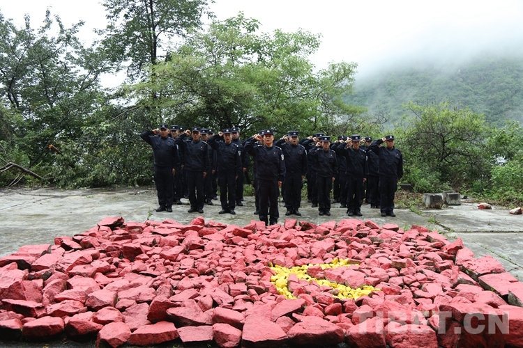 圖為機(jī)關(guān)民警在石頭堆砌的黨旗前重溫入黨誓詞 攝影:鄒興國(guó)