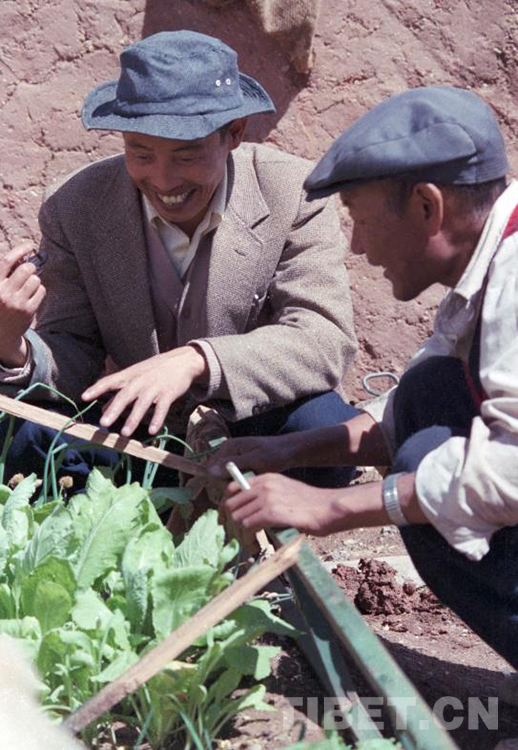 這是時(shí)任雙湖辦事處(現(xiàn)雙湖縣)紀(jì)律檢查委員會(huì)書記的熊亮兵(左),正在觀察自己在家門口通過(guò)搭塑料薄膜小篷試種的蔬菜(唐召明1987年攝)