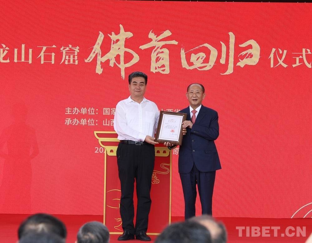 儀式上,國家文物局政策法規(guī)司司長陸瓊向天龍山石窟博物館館長于灝頒發(fā)文物入藏清冊。太原市委副書記、市長張新偉向佛首捐贈人張榮頒發(fā)“榮譽(yù)市民”證書。張榮表示將太原市政府頒發(fā)的獎金捐出,用于支持文物追索返還工作。