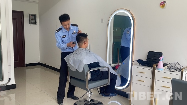 民警頓珠主動承擔起了為戰(zhàn)友們理發(fā)的工作。理發(fā)這門手藝,是頓珠自學來的。參加工作之前,他就在老家村莊和鄉(xiāng)親們相互幫忙剪頭發(fā)。參加工作后,他就利用回家探親休假的時間學習理發(fā)技術。時間久了,他的理發(fā)技術越來越成熟,手藝也越來越好。每當節(jié)假日、周末,大家在休息的時候,他的小理發(fā)室就會變得異?;鸨?、剪、吹,整天都是忙忙碌碌的。漸漸地“托尼”老師——頓珠的名聲傳遍了樟木鎮(zhèn),在鎮(zhèn)里工作的建設工人也常常會慕名前來。