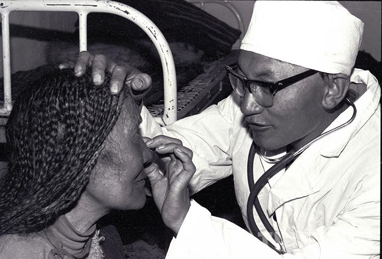 這是文部辦事處(現(xiàn)尼瑪縣)衛(wèi)生院院長羅桑多吉正在為住院牧民患者診治眼睛疾病(唐召明1987年攝)