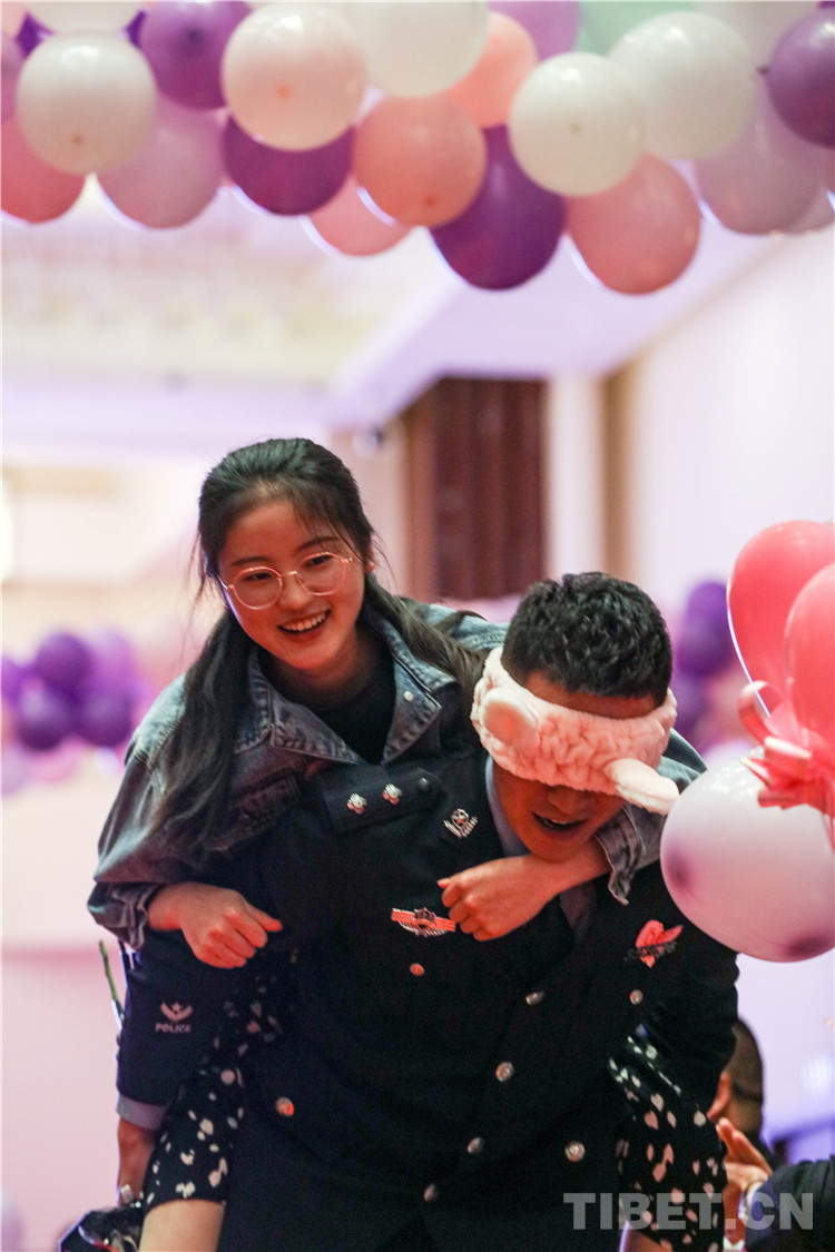活動過程中,總站形象宣傳片《我是誰》,向女嘉賓們展現(xiàn)了西藏移民管理警察的職業(yè)特點,使女嘉賓對民警工作職責產(chǎn)生了初步的認識。在主持人的引導下,精彩的才藝展示和豐富的游戲環(huán)節(jié)很快將現(xiàn)場氣氛推向一個接一個的高潮?;佑螒颉盃渴譅繍邸薄靶挠徐`犀”“守護愛情”“唯愛接力”通過聆聽詩句抓緊手指、借助比劃你問我答,相互協(xié)助完成任務等方式增進了男女嘉賓之間的了解和默契,促進了相互之間更好交流。男女嘉賓才藝表演和日喀則邊境管理支隊1753樂隊送上的精彩曲目,令活動現(xiàn)場青春洋溢。最終,18對男女嘉賓互生情愫,牽手成功,36對交換聯(lián)系方式,開啟更加深入的幸福交流。