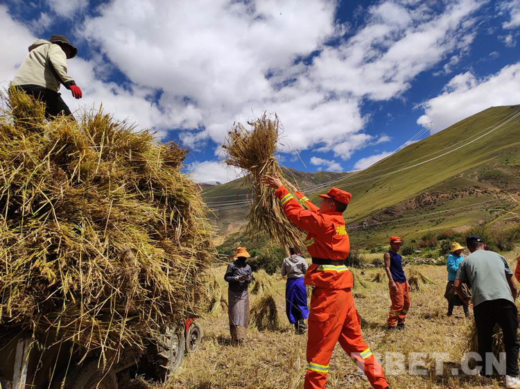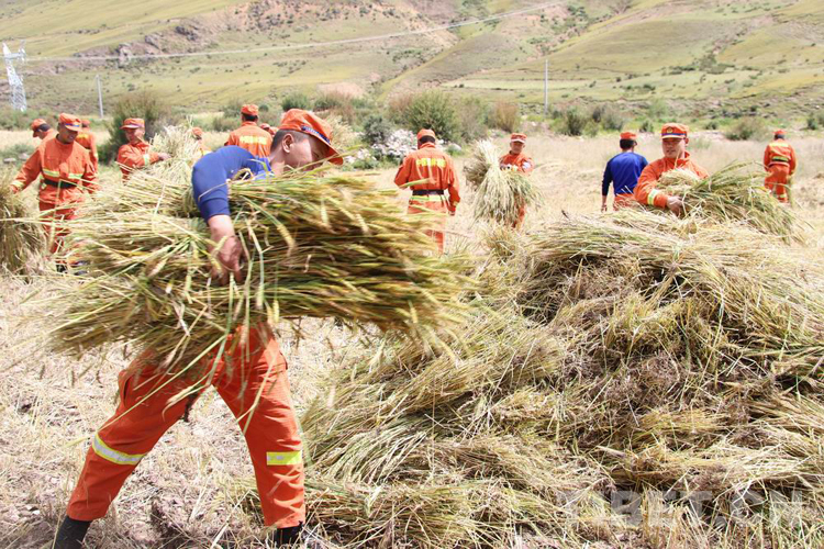 中國西藏網(wǎng)訊 農(nóng)諺說:“夏忙半個(gè)月,秋忙四十天?!鼻锸諏r(nóng)民來說至關(guān)重要,盼了一年的勞動成果,終于要?dú)w倉了。近日,為了幫助西藏自治區(qū)昌都市左貢縣田妥鎮(zhèn)亞中村群眾及時(shí)收割地里熟透了的青稞,昌都市左貢縣森林消防中隊(duì)指戰(zhàn)員們放棄休息時(shí)間,走進(jìn)田間,與鄉(xiāng)親們一起打響糧食搶收保衛(wèi)戰(zhàn),確保地里的青稞全部歸倉。