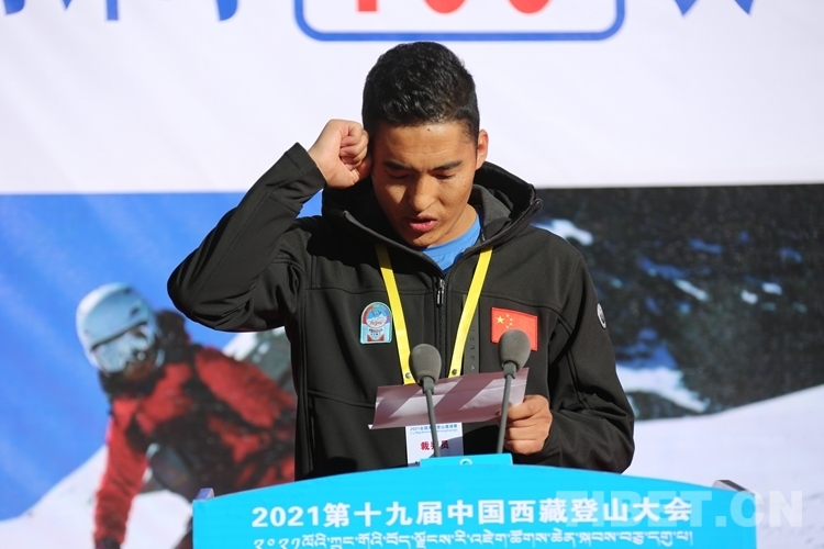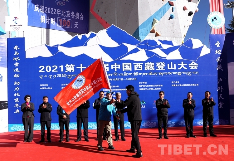 圖為國(guó)家體育總局登山運(yùn)動(dòng)管理中心副主任、中國(guó)登山協(xié)會(huì)副主席、中國(guó)登山隊(duì)隊(duì)長(zhǎng)王勇峰為2021第十九屆中國(guó)西藏登山大會(huì)授旗 攝影:賈華加