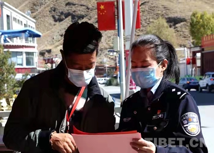 “出家門(mén),戴口罩,少聚會(huì),少串門(mén),非常時(shí)期要留神。勤洗手,講衛(wèi)生,室內(nèi)開(kāi)窗多通風(fēng)。舊口罩,要收起,有害垃圾要處理……”民警珠央正在使用漢藏雙語(yǔ)向駐地群眾宣講防疫口訣。