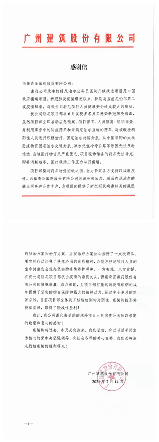 患者經(jīng)多次核酸檢測轉(zhuǎn)陰未復(fù)陽后,廣州建筑集團特地給西藏奇正藏藥股份有限公司寫了一份感謝信,信中寫到:西藏奇正藏藥股份有限公司為項目部提供了新型冠狀病毒肺炎的藏醫(yī)藥防治方案和治療方案,并按治療方案熱心捐贈了一大批藥品,用實際行動詮釋了扶危濟困的光彩精神,為我方駐尼項目人員的生命健康安全筑起堅實的疫情防護屏障。一方有難,八方支援,在我公司駐尼項目部抗擊疫情的緊要關(guān)頭,西藏奇正藏藥股份有限公司的慷慨解囊、鼎力相助,為項目部打贏這場沒有硝煙的戰(zhàn)爭提供了堅實的物資保障和強大的精神動力。