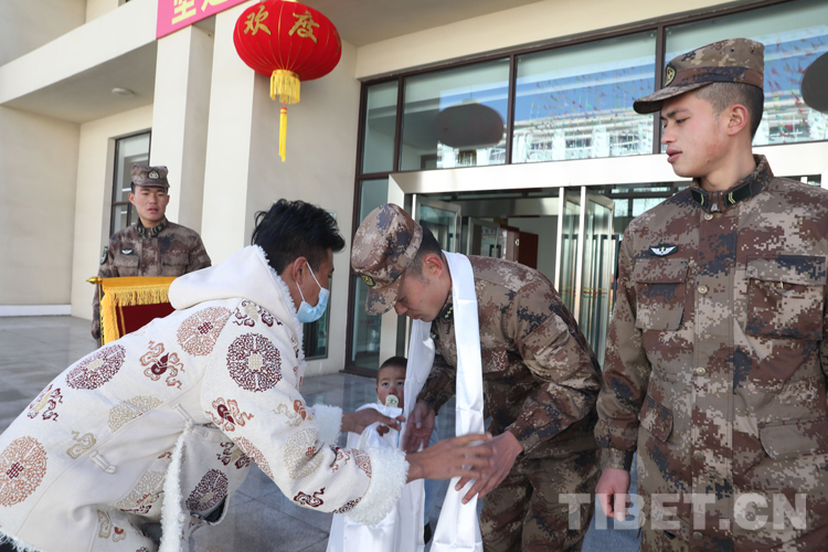 圖為兒童家長為官兵獻上哈達