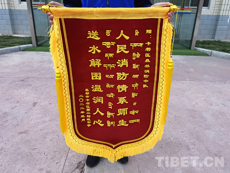 中國西藏網訊 一面錦旗,凝聚著群眾對消防隊伍誠摯的謝意和真摯的情感。4月1日,西藏自治區(qū)昌都市卡若區(qū)森林消防中隊迎來了一批“特殊的客人”(昌都市第二初級中學的師生代表),他們將一面繡有“人民消防情系師生 送水解困溫潤人心”的錦旗贈送給中隊全體人員,向中隊全體消防救援人員表示衷心感謝。
