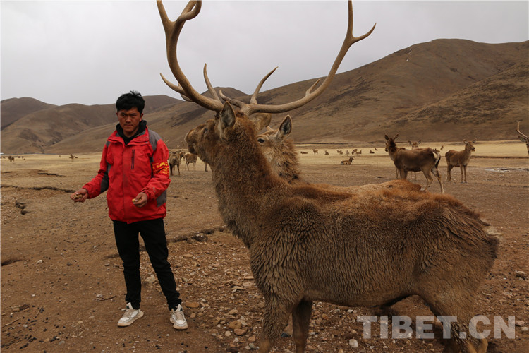 圖為哥哥白瑪澤旺呼喚鹿群過來覓食