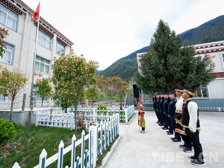 來(lái)自派鎮(zhèn)雪卡村的5歲小女孩旦增玉珍在林芝邊境管理支隊(duì)派邊境派出所,與移民管理警察共同參加升旗儀式。還在上幼兒園的她,像學(xué)校里的哥哥姐姐們一樣,一邊敬禮一邊唱國(guó)歌,同派出所民警一起接受愛國(guó)主義熏陶。