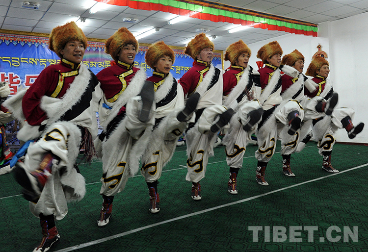 這是班戈縣諧欽民間藝術團的年輕舞蹈演員,在北京華北電力大學禮堂進行彩排時的劇照(唐召明2015年9月28日攝)
