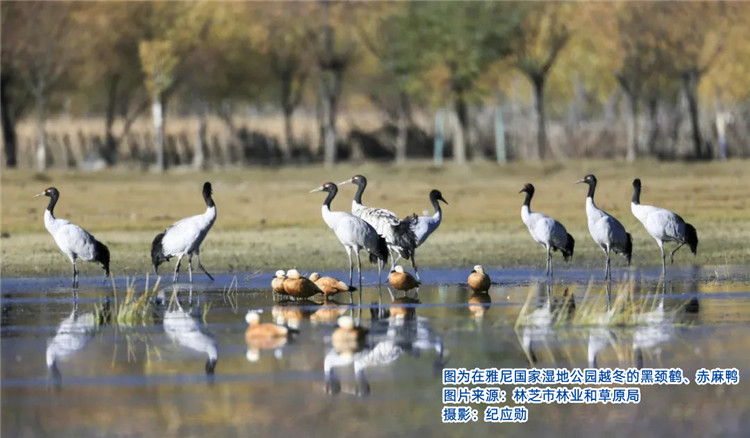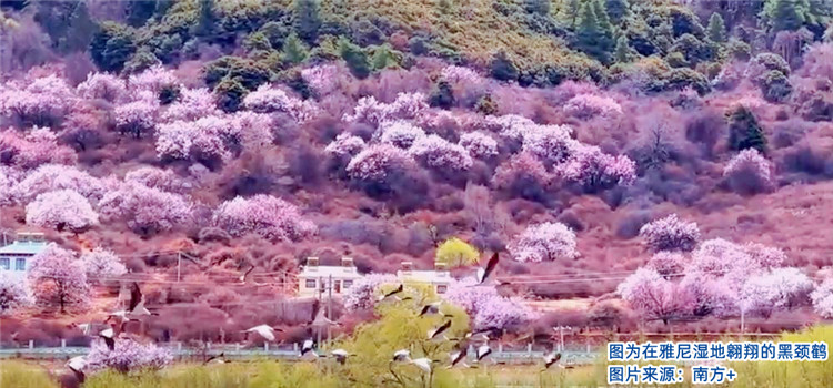 雅尼濕地生態(tài)的改善,不僅解決了困擾當(dāng)?shù)厝罕姸嗄甑娘L(fēng)沙問(wèn)題,而且其高原濕地獨(dú)特的壯美景觀吸引了大批慕名而來(lái)的游客。這里已成為著名的林芝桃花的最佳觀賞地之一,尤其是黑頸鶴在此停留之時(shí),正是桃花盛開(kāi)之際,灼灼其華間清啼入云,桃紅緋然間鶴舞翩躚的勝景是大自然對(duì)這里的人們矢志保護(hù)生態(tài)的回饋,更是整個(gè)西藏自治區(qū)著力生態(tài)保護(hù)成效的縮影。