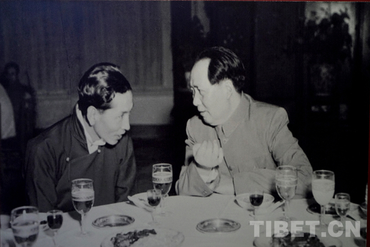 圖為1951年5月24日,毛澤東主席設宴慶?!吨醒肴嗣裾臀鞑氐胤秸P于和平解放西藏辦法的協議》的簽訂。宴會上,毛主席與阿沛?阿旺晉美(左)親切交談