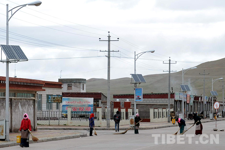 當(dāng)時(shí),經(jīng)過創(chuàng)業(yè)者三十多年的開發(fā)建設(shè),雙湖鎮(zhèn)中心已有了一條筆直寬敞的水泥路,道路兩旁還有漂亮的太陽能路燈和垃圾箱,黨政辦公樓、敬老院、職工活動(dòng)中心、幼兒園、普若崗日賓館、加油站等新建筑拔地而起,并建起了大型的太陽能光伏電站。