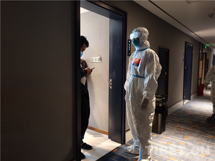 圖為日喀則大隊(duì)救援人員進(jìn)入定點(diǎn)隔離酒店收集信息