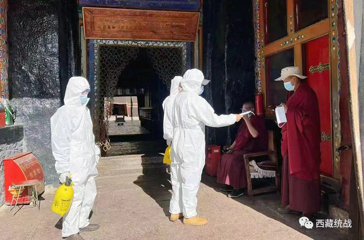 圖為西藏自治區(qū)日喀則市薩迦寺管委會在寺廟內(nèi)開展疫情防控工作 圖片來源:西藏統(tǒng)戰(zhàn)微信公眾號