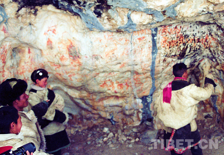這是科考人員在對(duì)一處洞穴巖畫(huà)進(jìn)行考察(唐召明2001年攝)