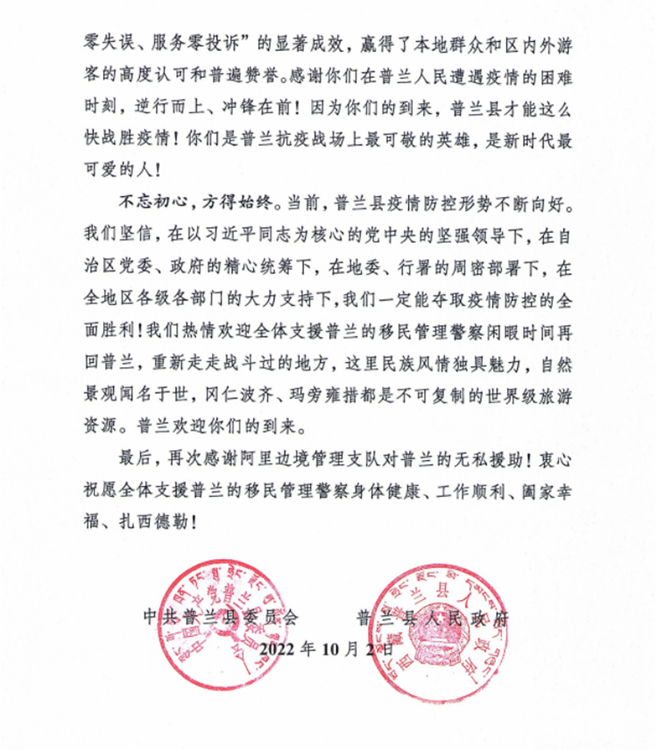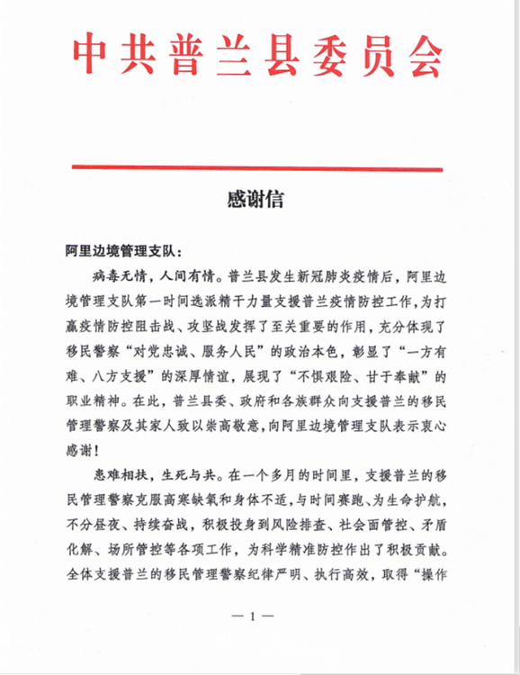中國(guó)西藏網(wǎng)訊 “普蘭縣發(fā)生新冠肺炎疫情后,阿里邊境管理支隊(duì)第一時(shí)間選派精干力量支援普蘭疫情防控工作,為打贏疫情防控阻擊戰(zhàn)、攻堅(jiān)戰(zhàn)發(fā)揮了至關(guān)重要的作用。”10月2日,西藏自治區(qū)阿里邊境管理支隊(duì)收到一封來自阿里地區(qū)普蘭縣委的感謝信。信中對(duì)阿里邊境管理支隊(duì)?wèi)?zhàn)“疫”一線民警在一個(gè)多月的疫情防控工作中,克服困難、勇于擔(dān)當(dāng)、不分晝夜、持續(xù)奮戰(zhàn)的抗疫工作表達(dá)了感謝,給予了肯定。