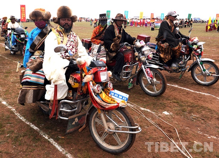 這是在雙湖縣慶祝建縣儀式上,著盛裝的牧民摩托車車隊(duì)正在通過主席臺(tái)(唐召明2013年7月26日攝)