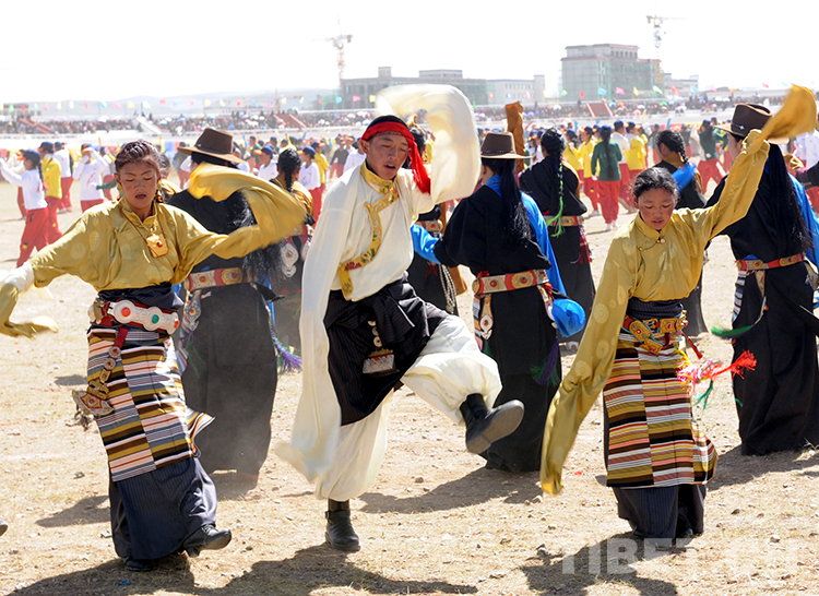 這是在藏北首府那曲鎮(zhèn)賽馬會(huì)上,牧民群眾正在跳大型”鍋莊“舞(唐召明2013年8月10日攝)