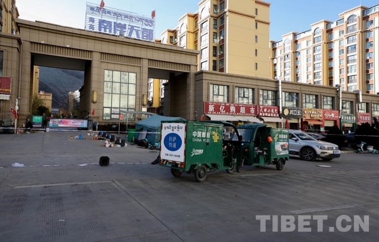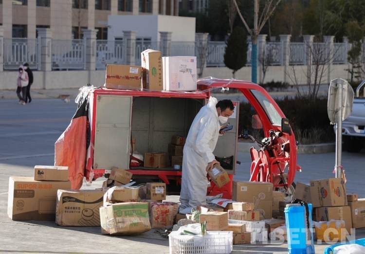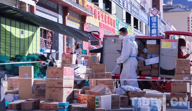 中國西藏網(wǎng)訊 隨著拉薩市疫情防控形勢整體持續(xù)向好,目前拉薩市郵政快遞業(yè)在落實好常態(tài)化疫情防控工作的基礎(chǔ)上,正有序復工復產(chǎn)。圖為快遞員無接觸配送快遞 攝影:賈華加(中國西藏網(wǎng) 記者/賈華加)