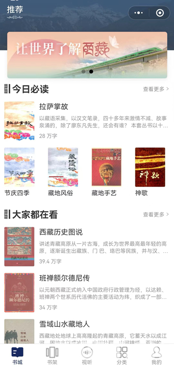 “掌讀西藏”為讀書公益類平臺,免費向讀者提供中國西藏主題的電子圖書。目前有《古格王國》《神歌》《達(dá)賴?yán)镛D(zhuǎn)世制度》《班禪額爾德尼傳》《拉薩掌故》《雪域山水藏地人》《節(jié)慶四季》《西藏歷史圖說》《進(jìn)軍西藏日記》等29本電子圖書。這些電子圖書都是作者寶貴的知識結(jié)晶,也是對中國西藏珍貴的歷史記憶,濃縮了幾代人見證中國西藏發(fā)展的時代烙印。