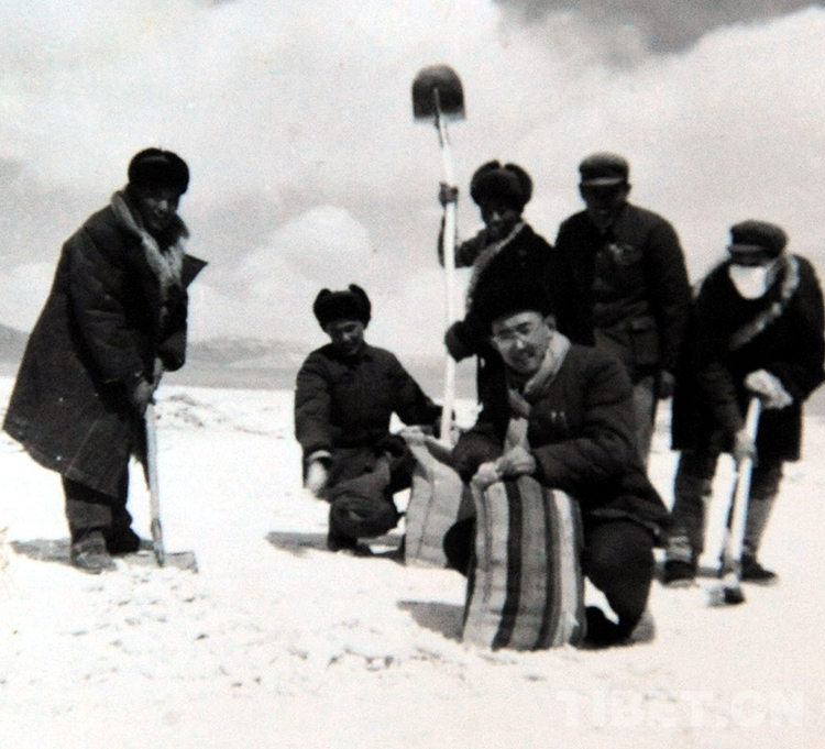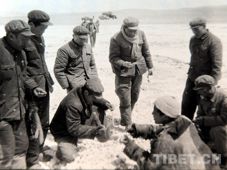 這是雙湖辦事處干部在鹽湖挖取自用鹽巴(唐召明翻拍資料照片,1976年攝)