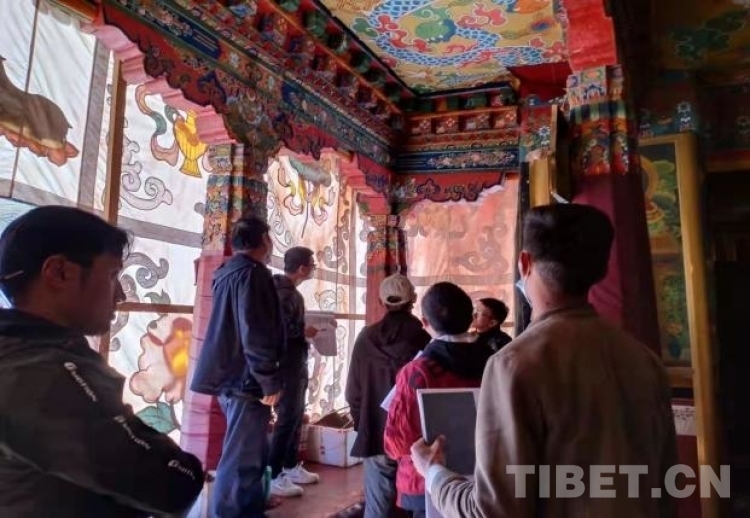 圖為2021年,西藏民族大學(xué)實(shí)習(xí)生參與檢查杰拉康寺木構(gòu)建筑的破損程度,并對(duì)設(shè)計(jì)方案提出意見