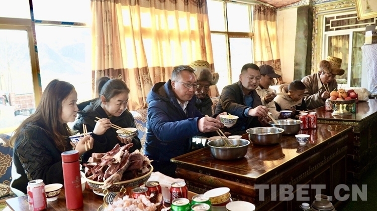 “這些干部和我們相處了這么長時(shí)間,都成自家人了。他們家在內(nèi)地,但因?yàn)楣ぷ鞅仨殘?jiān)守崗位。我們能做的也不多,就是請他們到家中來吃個(gè)簡單的團(tuán)圓飯?!?多章說著,老人的女兒央金熱情地端來酥油茶。