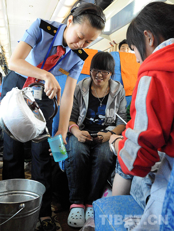 這是被藏族旅客稱為“格?;ā钡木┎剀囮?duì)三組乘務(wù)員魏若思在唐古拉山段為旅客送水(唐召明2010年7月4日攝)