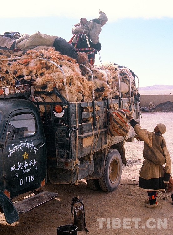 這是雙湖辦事處(現(xiàn)雙湖縣)和平鄉(xiāng)牧民正在裝車外運所交售的牛羊皮等畜產(chǎn)品(唐召明1987年攝)