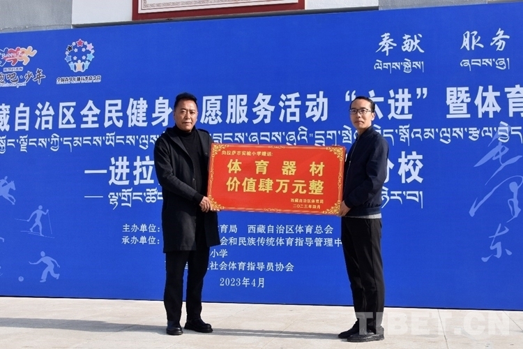 活動開幕式現(xiàn)場,西藏自治區(qū)體育局社體中心向拉薩市實驗小學東城分校,配發(fā)了價值四萬元整的校園體育器材,保障學生日常體育運動需要。