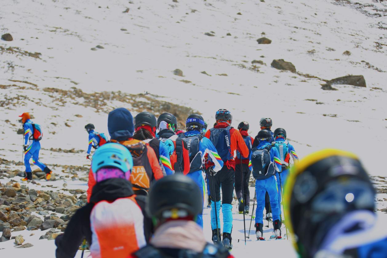 圖為滑雪運(yùn)動員們在教練的帶領(lǐng)下上山 攝影:德吉卓瑪