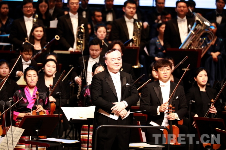 本場音樂會由中國文聯(lián)副主席、書記處書記,中央音樂學(xué)院院長,著名指揮家俞峰擔任指揮,中央音樂學(xué)院交響樂團與西藏自治區(qū)歌舞團愛樂樂團聯(lián)合伴奏。圖為本場音樂會指揮俞峰(前排中) 攝影:劉莉