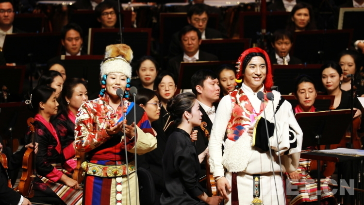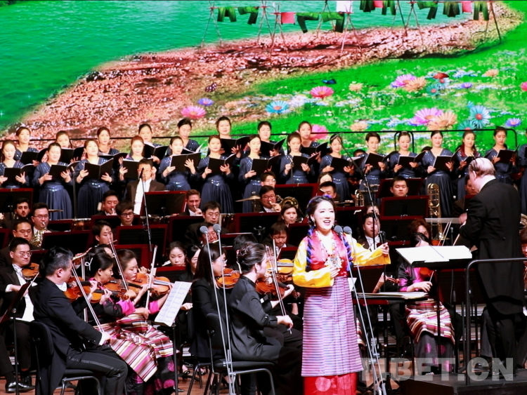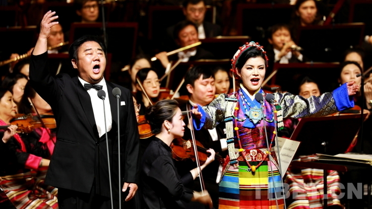 圖為中音歌唱家、國家一級演員霍勇,西藏自治區(qū)歌舞團青年女高音次仁央宗領(lǐng)合唱《美麗的西藏 可愛的家鄉(xiāng)》 攝影:劉莉