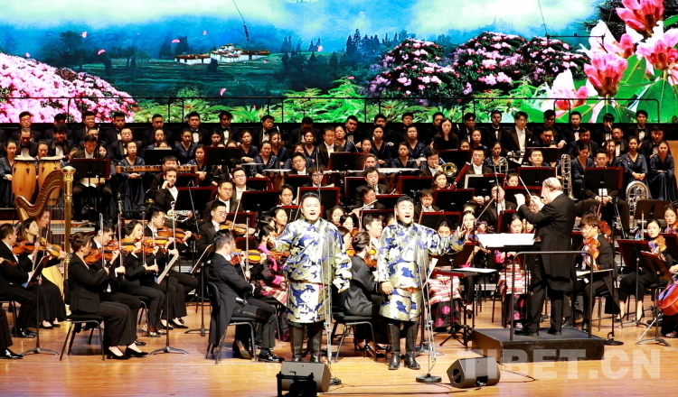 圖為音樂會引子部分,由西藏自治區(qū)藏劇團藏戲表演藝術(shù)家、國家一級演員班典旺久(前排左二)演繹的藏戲唱腔《祝福》,藏戲司鼓為西藏自治區(qū)藏劇團藏戲司鼓演奏家、國家一級演員扎西旺杰(前排左一) 西藏自治區(qū)黨委宣傳部供圖