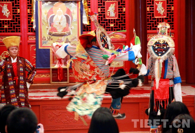 圖為拉薩市城關區(qū)娘熱民間藝術團演員多吉次仁表演國家級非物質文化遺產“嘎爾”攝影:劉莉