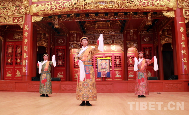 拉薩市城關區(qū)娘熱民間藝術團在藏戲這一非物質文化遺產瑰寶的傳承中碩果累累,擁有西藏自治區(qū)級、拉薩市級和拉薩市城關區(qū)級多位非遺傳承人,是西藏自治區(qū)100多個民間劇團中唯一一個能夠完整表演“八大藏戲”的團體。圖為拉薩市城關區(qū)娘熱民間藝術團表演的藏戲開場《溫巴頓》片段 攝影:劉莉