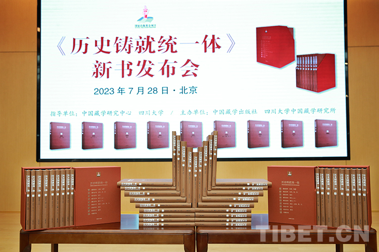 圖為發(fā)布會現(xiàn)場展覽的《歷史鑄就統(tǒng)一體:考古與文物所見西藏和中原關系資料研究》全套圖書 攝影:陳衛(wèi)國