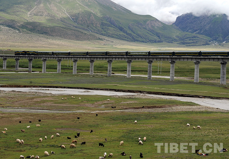 奔馳在藏北高原高架橋上的“天路”列車(唐召明2016年5月4日攝)