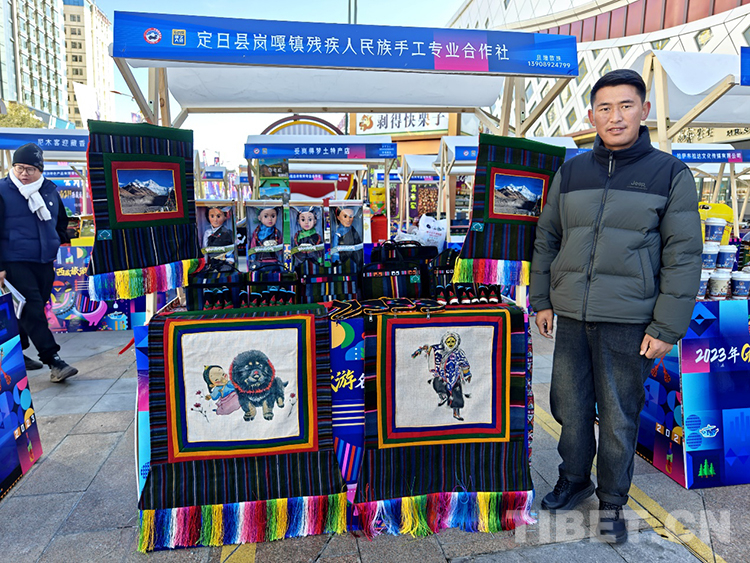 圖為定日縣崗嘎鎮(zhèn)殘疾人民族手工業(yè)專業(yè)合作社工作人員索朗次仁在自己的展臺前留影