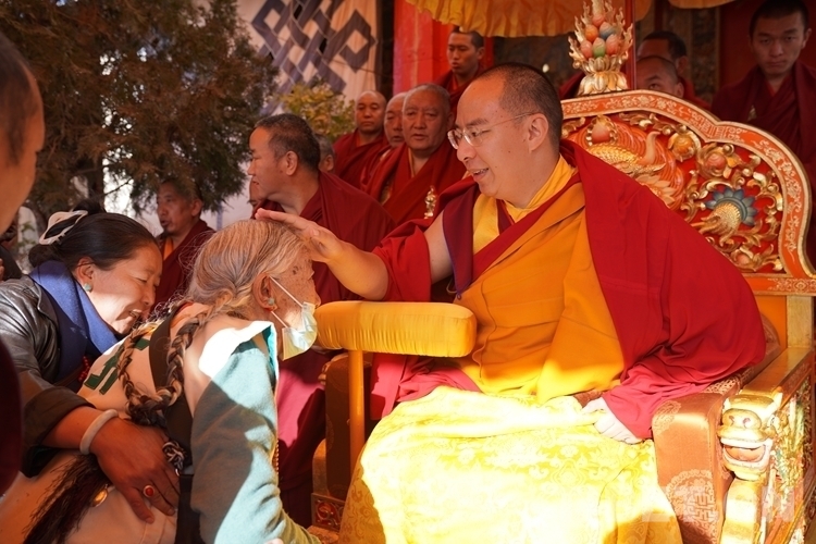 日喀則市桑珠孜區(qū)的索朗頓珠來到班禪面前,雙手合十將手持轉(zhuǎn)經(jīng)筒高高舉起,班禪見狀為其摸頂賜福,并為其轉(zhuǎn)經(jīng)筒開光加持?!艾F(xiàn)在生活美滿,今天又得到班禪仁波切的摸頂賜福和加持,感覺特別幸福?!彼骼暑D珠搖動著轉(zhuǎn)經(jīng)筒,戀戀不舍地回頭矚望。