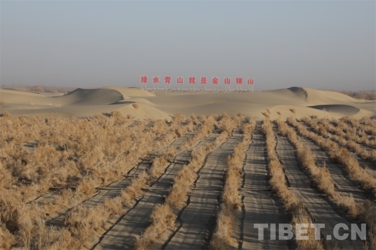 迎著日出的柔和光亮,步上沙漠綠洲觀景臺,就能與沙漠里的一抹紅色標(biāo)語“迎面相視”?!熬G水青山就是金山銀山”,這句鮮紅的標(biāo)語在一片金黃沙丘和梭梭林里面顯得格外醒目。在起伏緩和的山丘上,眼前的一小片沙漠綠洲成為了蔚然生態(tài)林工程的一個典型注解。