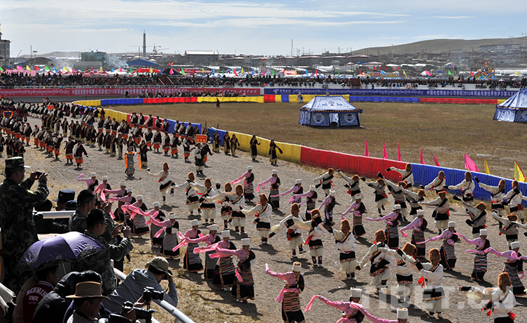 來自那曲地區(qū)(現那曲市)各縣代表隊在進行入場式表演。當日,那曲賽馬節(jié)在藏北首府那曲鎮(zhèn)開幕(唐召明2013年8月10日攝)