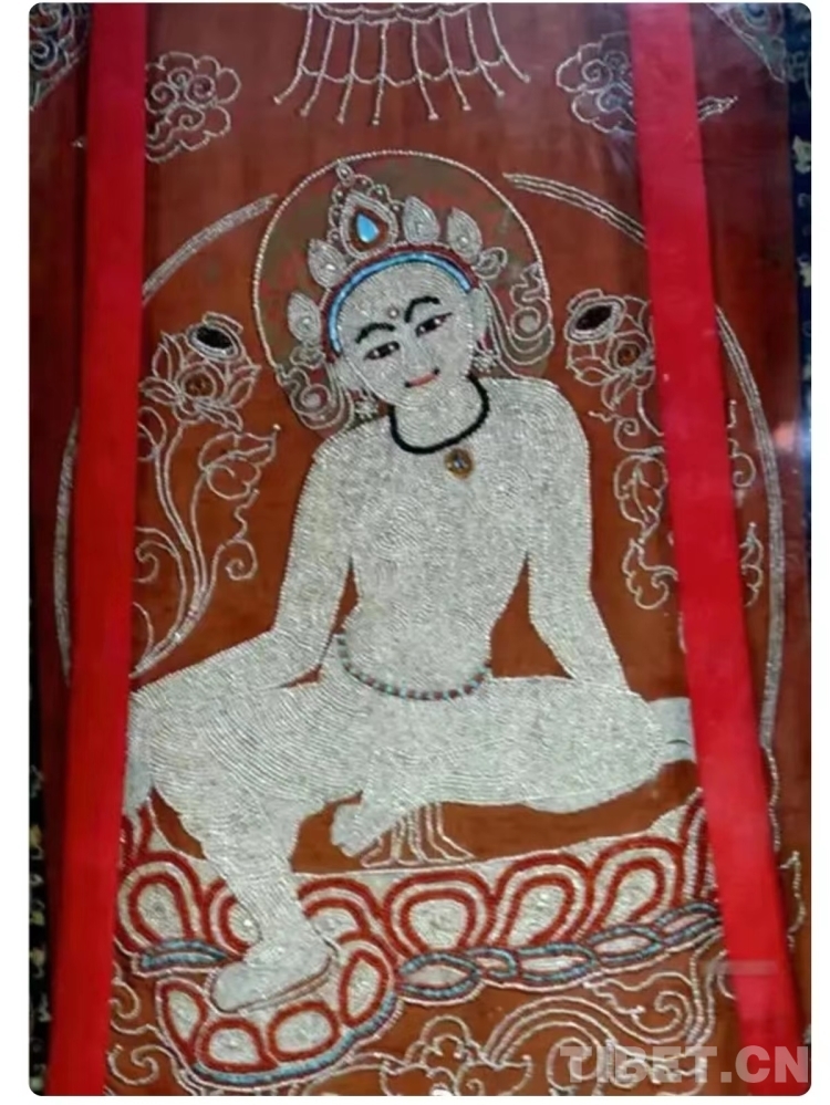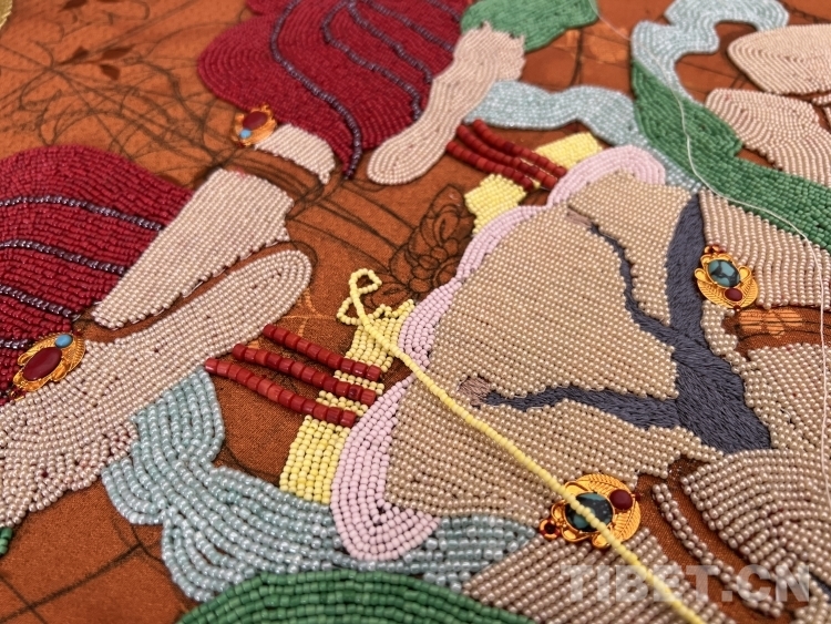 掌握了藏繡技藝,夫妻二人有了新的發(fā)展目標(biāo)。在傳承和發(fā)展傳統(tǒng)堆繡技藝的同時(shí),土旦想要創(chuàng)新更有特色的藏繡作品,于是創(chuàng)作“珍珠唐卡”的想法在他腦海中萌生?!爸韵胍獎?chuàng)作珍珠唐卡,是因?yàn)橛写挝以谏侥系牟樗驴吹搅恕^世音菩薩憩息圖’這幅珍珠唐卡,我被它精美絕倫的制作工藝深深吸引,心想自己從事堆繡創(chuàng)作多年,也應(yīng)該去嘗試制作‘珠繡’作品了?!蓖恋┫蛴浾咧v述了他與珍珠唐卡的“結(jié)緣”經(jīng)歷。