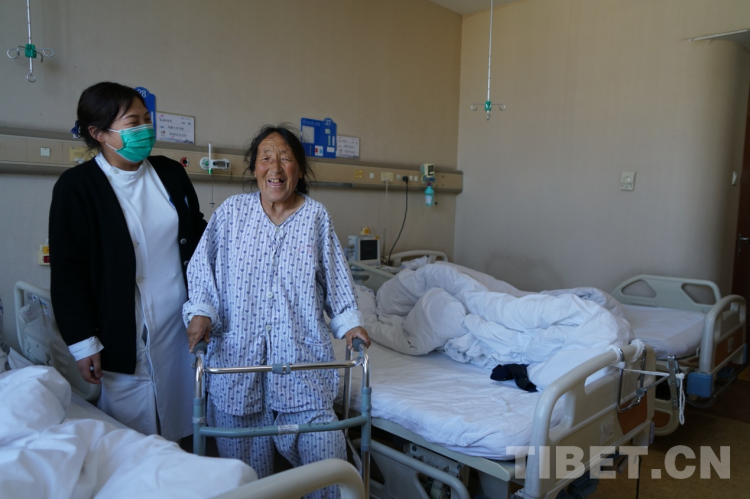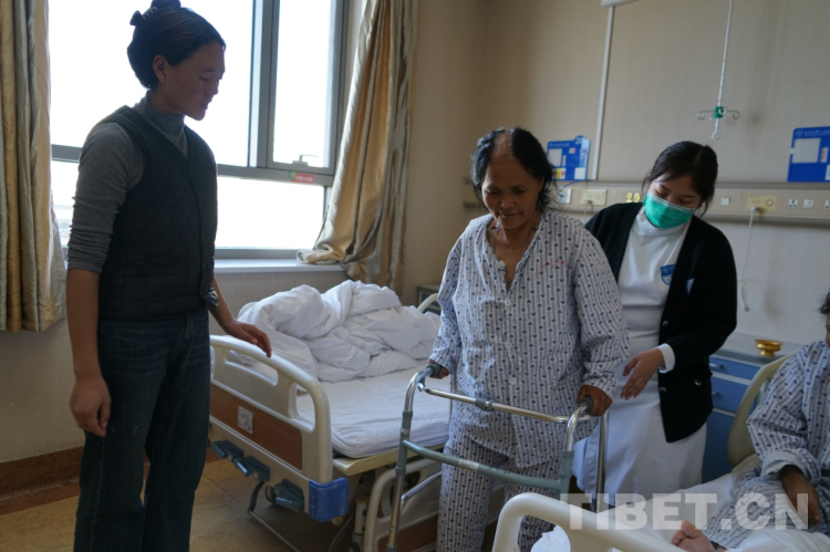 “卓瑪,你快給媽媽翻譯一下,用扶手架轉(zhuǎn)身的時(shí)候90度慢慢轉(zhuǎn),不要一次性轉(zhuǎn)180度,容易摔倒?!惫顷P(guān)節(jié)科護(hù)士薛小英從剛剛的驚慌中回過神來,對著29床病人布姆的女兒大聲叮囑道。就在剛才,這個(gè)來自洛隆縣59歲的右膝大骨節(jié)病患者布姆在骨關(guān)節(jié)手術(shù)24小時(shí)后,借助扶手架,在護(hù)士的指導(dǎo)下已經(jīng)能夠下床走路了。只是初次使用扶手架還不太熟悉,剛才180度的大轉(zhuǎn)彎讓一旁陪護(hù)的護(hù)士不禁捏了一把汗。女兒卓瑪聽到護(hù)士的話后趕忙告訴媽媽走路轉(zhuǎn)身要慢點(diǎn),小心別摔倒。