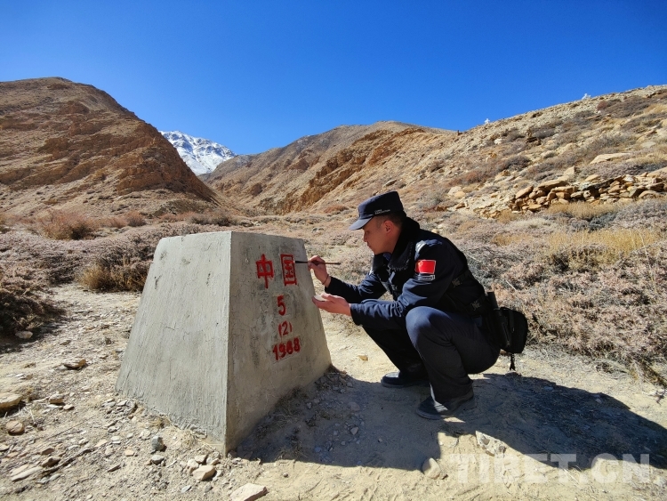 巡邏結(jié)束回到執(zhí)勤點(diǎn)后,邊巴次仁并沒(méi)有卸下執(zhí)勤裝備,而是拿著毛筆和紅油漆朝著執(zhí)勤點(diǎn)的河對(duì)岸走去,過(guò)河幾百米便是中尼5號(hào)界樁。“只有堅(jiān)守在邊境的我們才能體驗(yàn)到,除夕這天,為界碑描紅的自豪感?!彼贸雒P跟紅漆一筆一劃地描著界碑上的每一個(gè)字?!懊杓t界碑那一刻,眼前是界碑,身后是祖國(guó),我們守的是萬(wàn)家燈火?!边叞痛稳恃凵駡?jiān)定地看著身前的界碑說(shuō)。