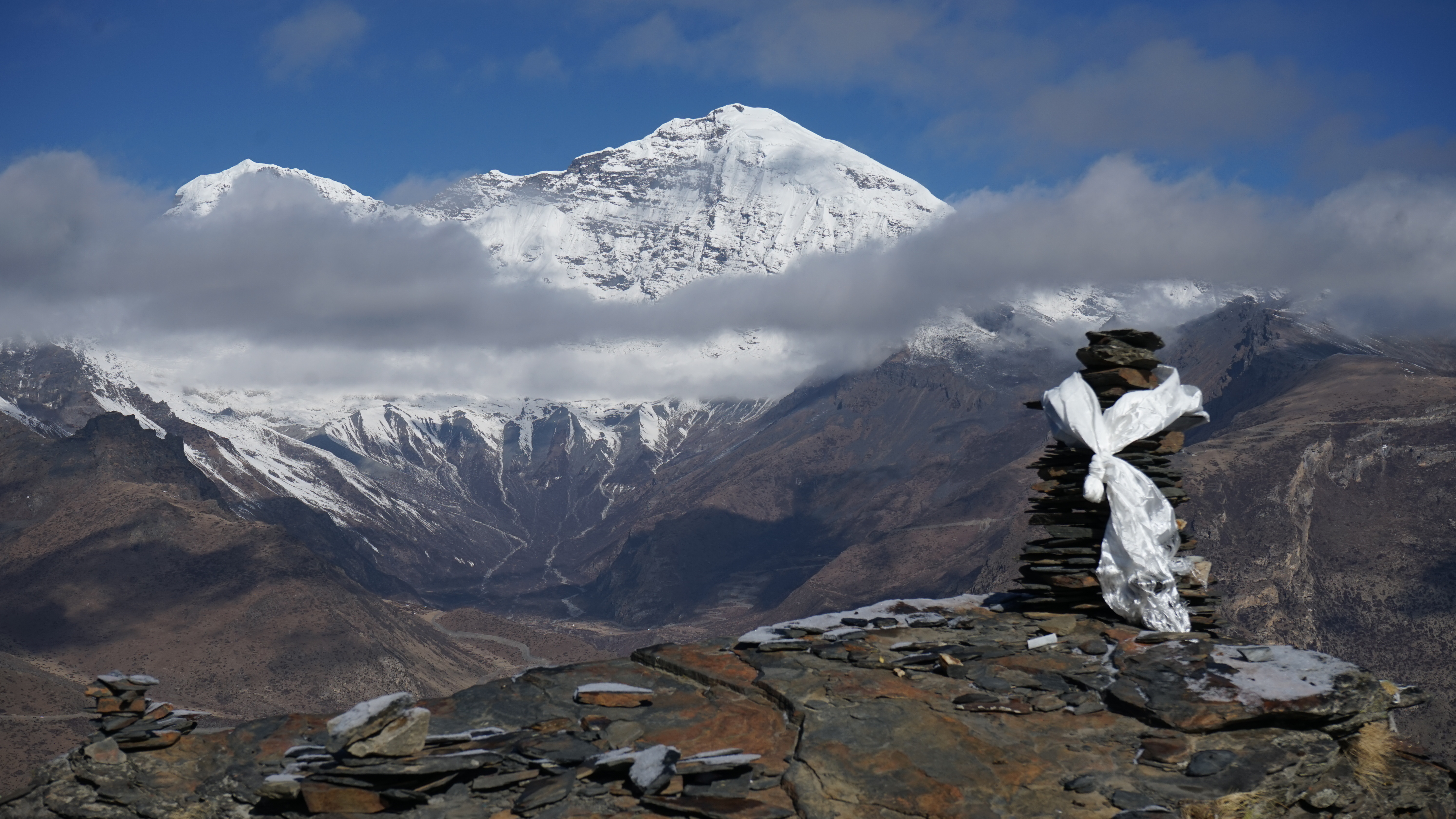 路上雪還在下,山里霧蒙蒙,能見度極低。到了波拉山頂,視野終于開闊了起來,能看到遠處漫山的經(jīng)幡。翻過這座山,天色又開始忽明忽暗,似乎云本身就在那里,是我們不停從這片云進去,從那片云出來。但總歸沒那么霧茫茫了。
